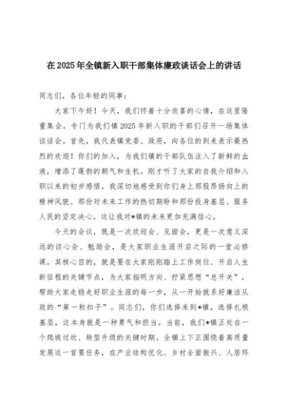 【七哥公文】2025年:在2025年全镇新入职干部集体廉政谈话会上的讲话+更多免费公文+VX:QiGeGongWen2024