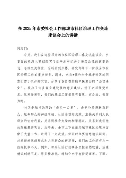 【七哥公文】2025年:在2025年市委社会工作部城市社区治理工作交流座谈会上的讲话+更多免费公文+VX:QiGeGongWen2024