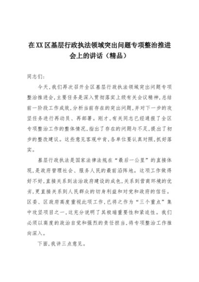 【七哥公文】2025年:在XX区基层行政执法领域突出问题专项整治推进会上的讲话(精品)+更多免费公文+VX:QiGeGongWen2024