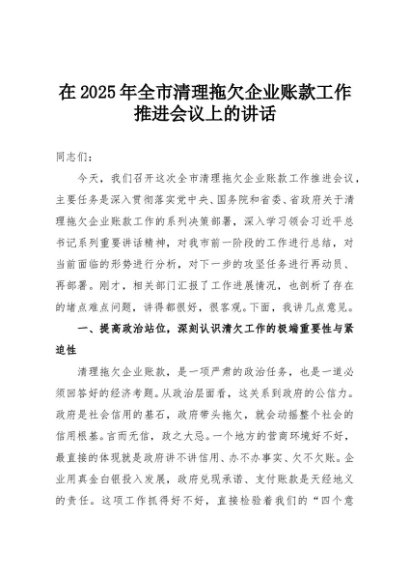 【七哥公文】2025年:在2025年全市清理拖欠企业账款工作推进会议上的讲话+更多免费公文+VX:QiGeGongWen2024