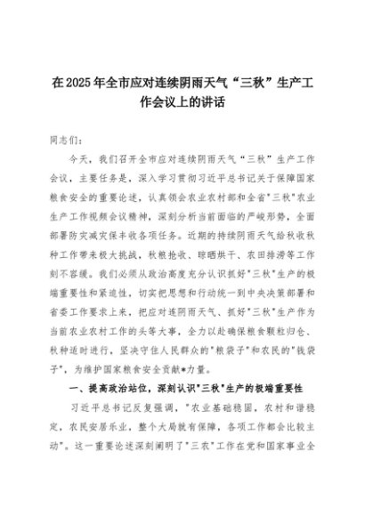 【七哥公文】2025年:在2025年全市应对连续阴雨天气“三秋”生产工作会议上的讲话+更多免费公文+VX:QiGeGongWen2024