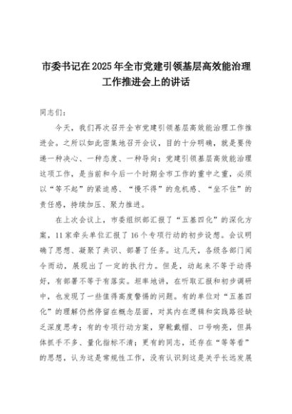 【七哥公文】2025年:市委书记在2025年全市党建引领基层高效能治理工作推进会上的讲话+更多免费公文+VX:QiGeGongWen2024