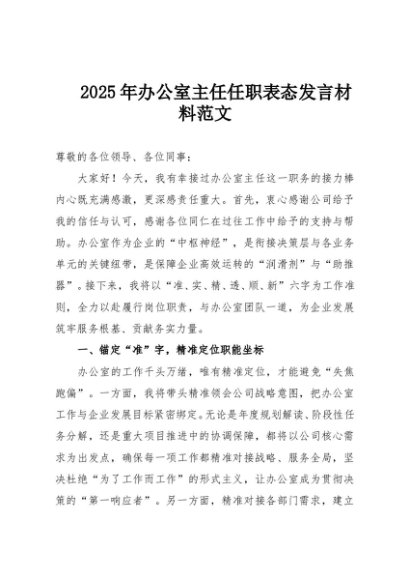 / 【七哥公文】2025年:2025年办公室主任任职表态发言材料范文+更多免费公文+VX:QiGeGongWen2024