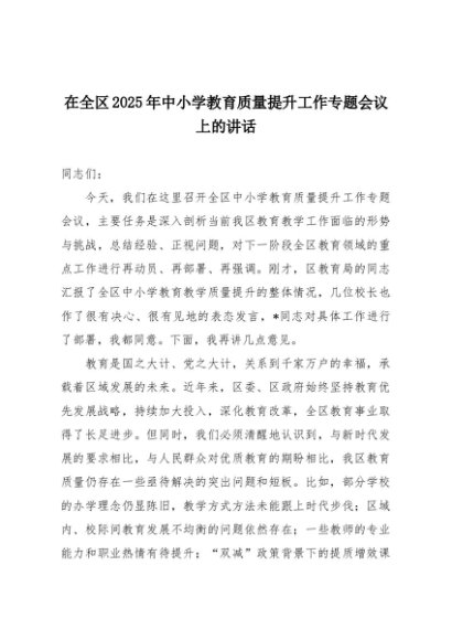 【七哥公文】2025年:在全区2025年中小学教育质量提升工作专题会议上的讲话+更多免费公文+VX:QiGeGongWen2024