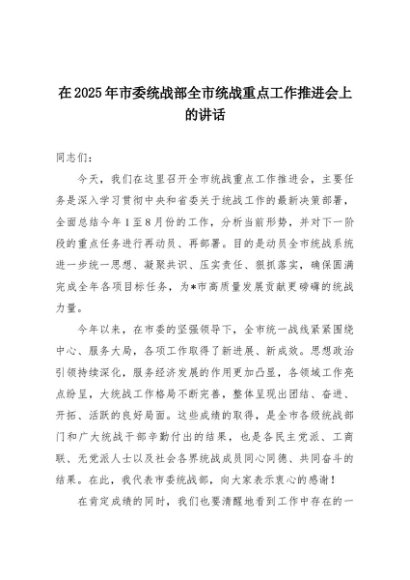 【七哥公文】2025年:在2025年市委统战部全市统战重点工作推进会上的讲话+更多免费公文+VX:QiGeGongWen2024