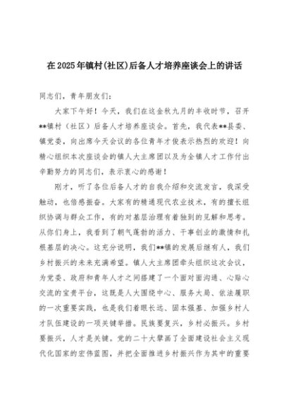 【七哥公文】2025年:在2025年镇村(社区)后备人才培养座谈会上的讲话+更多免费公文+VX:QiGeGongWen2024