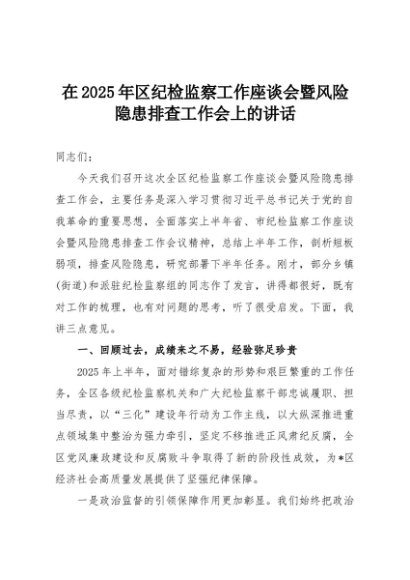 【七哥公文】2025年:在2025年区纪检监察工作座谈会暨风险隐患排查工作会上的讲话+更多免费公文+VX:QiGeGongWen2024