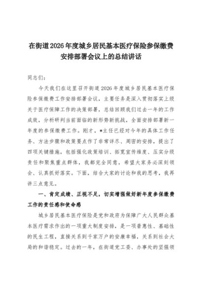 【七哥公文】2025年:在街道2026年度城乡居民基本医疗保险参保缴费安排部署会议上的总结讲话+更多免费公文+VX:QiGeGongWen2024
