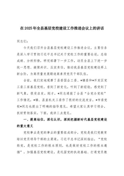 【七哥公文】2025年:在2025年全县基层党校建设工作推进会议上的讲话+更多免费公文+VX:QiGeGongWen2024