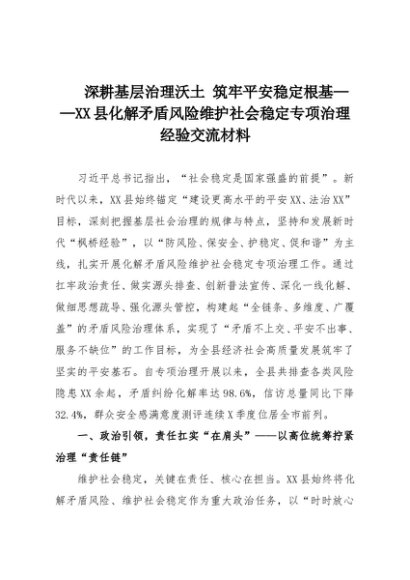 【七哥公文】2025年:深耕基层治理沃土 筑牢平安稳定根基——XX县化解矛盾风险维护社会稳定专项治理经验交流材料+更多免费公文+VX:QiGeGongWen2024