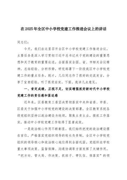 【七哥公文】2025年:在2025年全区中小学校党建工作推进会议上的讲话+更多免费公文+VX:QiGeGongWen2024
