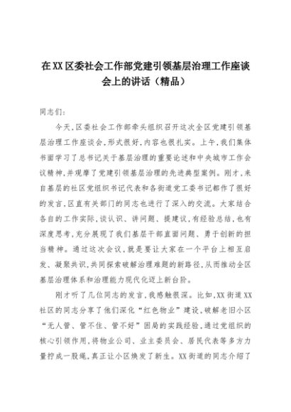 【七哥公文】2025年:在XX区委社会工作部党建引领基层治理工作座谈会上的讲话(精品)+更多免费公文+VX:QiGeGongWen2024