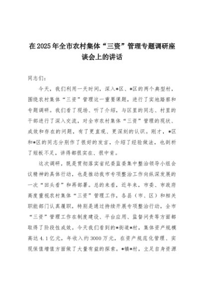 【七哥公文】2025年:在2025年全市农村集体“三资”管理专题调研座谈会上的讲话+更多免费公文+VX:QiGeGongWen2024