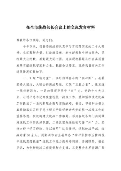 / 【七哥公文】2025年:在全市统战部长会议上的交流发言材料+更多免费公文+VX:QiGeGongWen2024