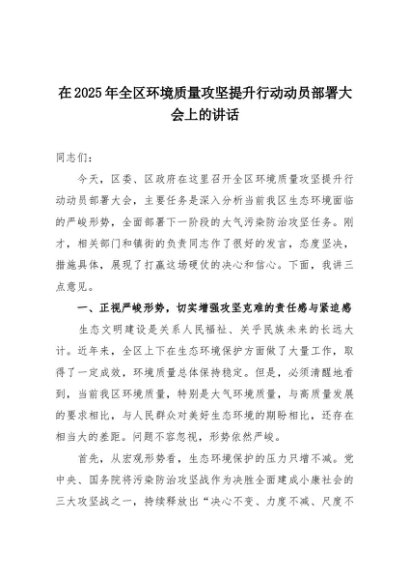 【七哥公文】2025年:在2025年全区环境质量攻坚提升行动动员部署大会上的讲话+更多免费公文+VX:QiGeGongWen2024