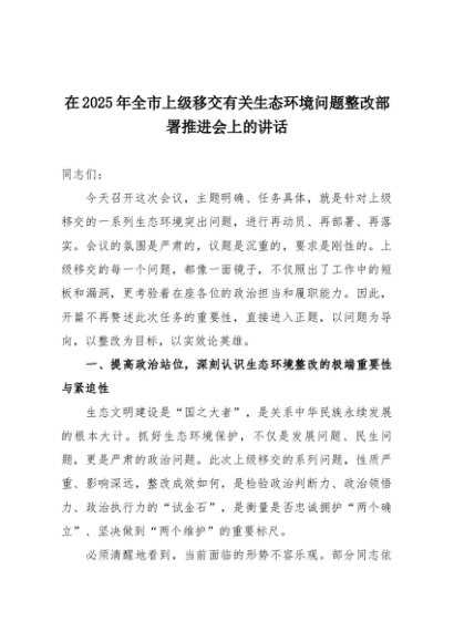 【七哥公文】2025年:在2025年全市上级移交有关生态环境问题整改部署推进会上的讲话+更多免费公文+VX:QiGeGongWen2024