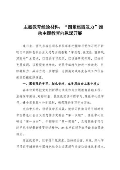 【七哥公文】2025年:主题教育经验材料:“四聚焦四发力”推动主题教育向纵深开展+更多免费公文+VX:QiGeGongWen2024