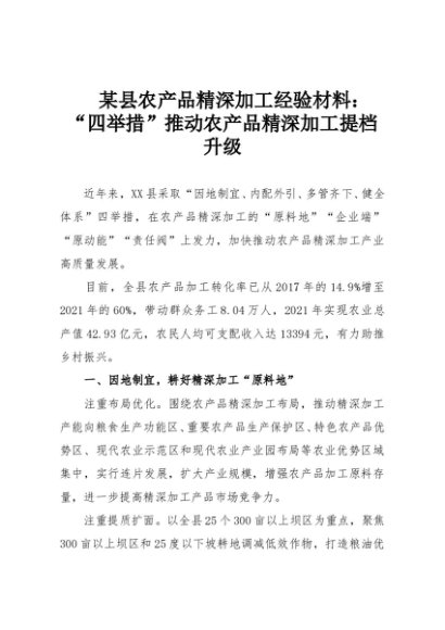 【七哥公文】2025年:某县农产品精深加工经验材料:“四举措”推动农产品精深加工提档升级+更多免费公文+VX:QiGeGongWen2024