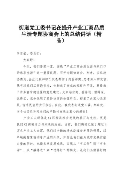 【七哥公文】2025年:街道党工委书记在提升产业工商品质生活专题协商会上的总结讲话(精品)+更多免费公文+VX:QiGeGongWen2024