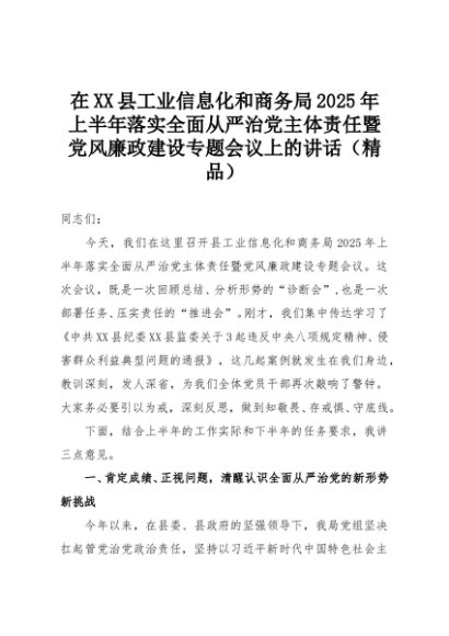 【七哥公文】2025年:在XX县工业信息化和商务局2025年上半年落实全面从严治党主体责任暨党风廉政建设专题会议上的讲话(精品)+更多免费公文+VX:QiGeGongWen2024