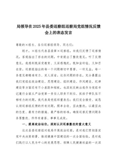 【七哥公文】2025年:局领导在2025年县委巡察组巡察局党组情况反馈会上的表态发言+更多免费公文+VX:QiGeGongWen2024
