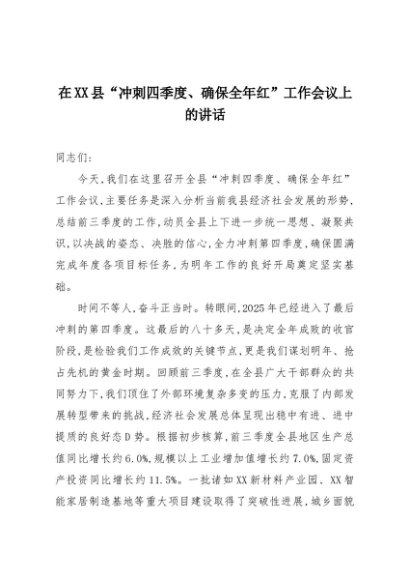 【七哥公文】2025年:在XX县“冲刺四季度、确保全年红”工作会议上的讲话+更多免费公文+VX:QiGeGongWen2024