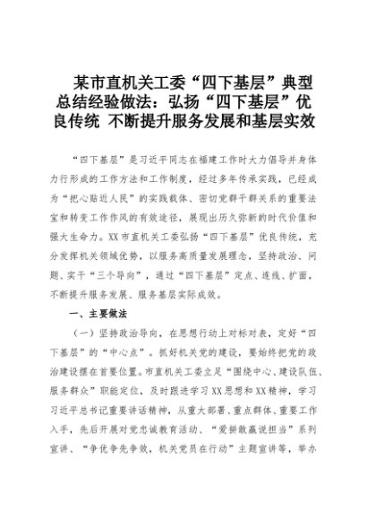 【七哥公文】2025年:某市直机关工委“四下基层”典型总结经验做法:弘扬“四下基层”优良传统 不断提升服务发展和基层实效+更多免费公文+VX:QiGeGongWen2024