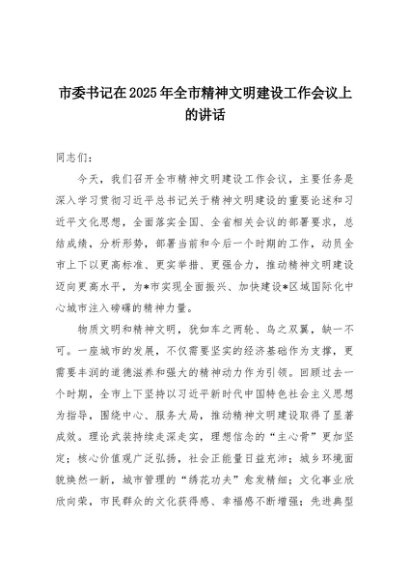 【七哥公文】2025年:市委书记在2025年全市精神文明建设工作会议上的讲话+更多免费公文+VX:QiGeGongWen2024