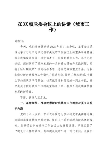/ 【七哥公文】2025年:在XX镇党委会议上的讲话(城市工作)+更多免费公文+VX:QiGeGongWen2024
