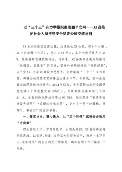 【七哥公文】2025年:以“三个三”有力举措织密边疆平安网——XX县维护社会大局持续安全稳定经验交流材料+更多免费公文+VX:QiGeGongWen2024