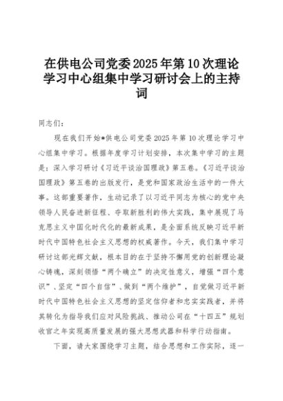 【七哥公文】2025年:在供电公司党委2025年第10次理论学习中心组集中学习研讨会上的主持词+更多免费公文+VX:QiGeGongWen2024