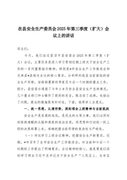 【七哥公文】2025年:在县安全生产委员会2025年第三季度(扩大)会议上的讲话+更多免费公文+VX:QiGeGongWen2024