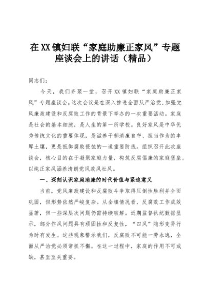 【七哥公文】2025年:在XX镇妇联“家庭助廉正家风”专题座谈会上的讲话(精品)+更多免费公文+VX:QiGeGongWen2024