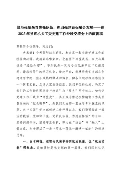 【七哥公文】2025年:筑坚强堡垒育先锋队伍,抓四强建设促融合发展——在2025年县直机关工委党建工作经验交流会上的演讲稿+更多免费公文+VX:QiGeGongWen2024