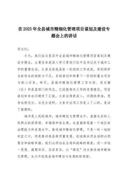 【七哥公文】2025年:在2025年全县城市精细化管理项目谋划及建设专题会上的讲话+更多免费公文+VX:QiGeGongWen2024