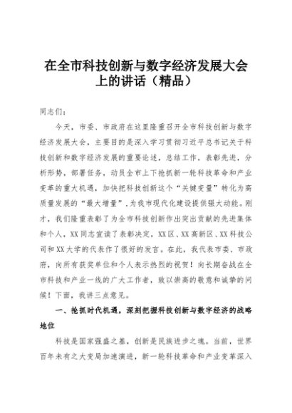 / 【七哥公文】2025年:在全市科技创新与数字经济发展大会上的讲话(精品)+更多免费公文+VX:QiGeGongWen2024