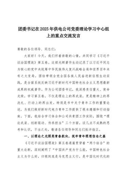 【七哥公文】2025年:团委书记在2025年供电公司党委理论学习中心组上的重点交流发言+更多免费公文+VX:QiGeGongWen2024
