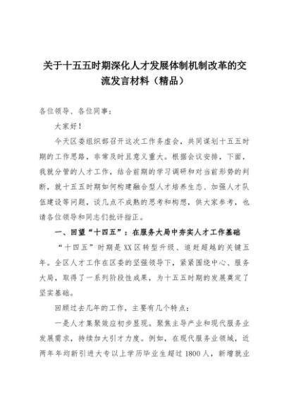 【七哥公文】2025年:关于十五五时期深化人才发展体制机制改革的交流发言材料(精品)+更多免费公文+VX:QiGeGongWen2024