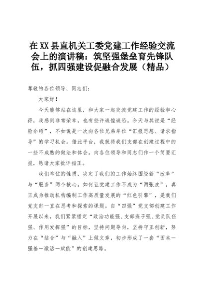【七哥公文】2025年:在XX县直机关工委党建工作经验交流会上的演讲稿:筑坚强堡垒育先锋队伍,抓四强建设促融合发展(精品)+更多免费公文+VX:QiGeGongWen2024