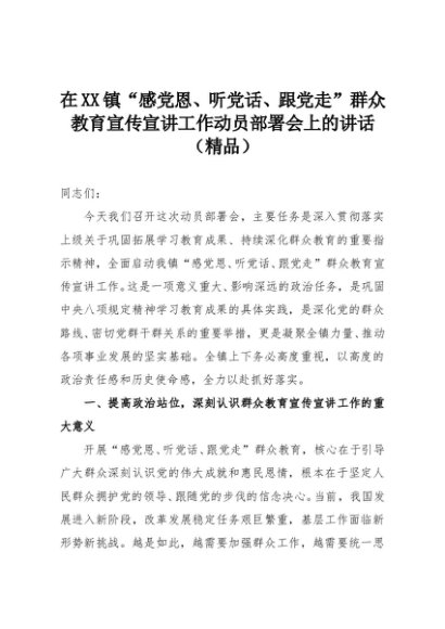 【七哥公文】2025年:在XX镇“感党恩、听党话、跟党走”群众教育宣传宣讲工作动员部署会上的讲话(精品)+更多免费公文+VX:QiGeGongWen2024