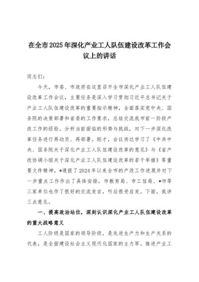 【七哥公文】2025年:在全市2025年深化产业工人队伍建设改革工作会议上的讲话+更多免费公文+VX:QiGeGongWen2024