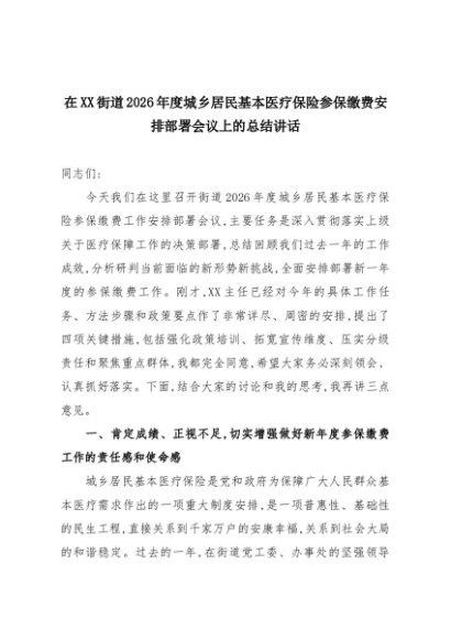 【七哥公文】2025年:在XX街道2026年度城乡居民基本医疗保险参保缴费安排部署会议上的总结讲话+更多免费公文+VX:QiGeGongWen2024