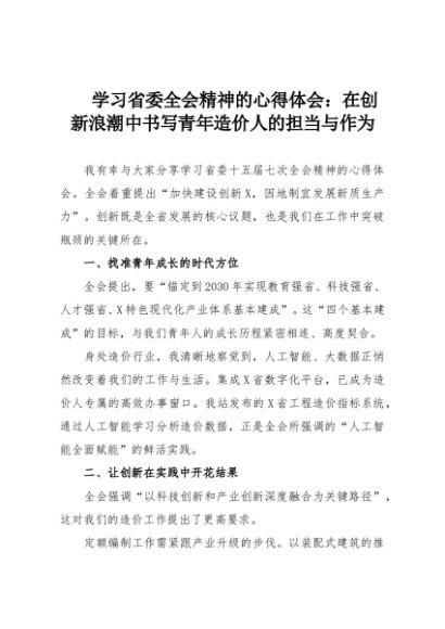 【七哥公文】2025年:学习省委全会精神的心得体会:在创新浪潮中书写青年造价人的担当与作为+更多免费公文+VX:QiGeGongWen2024