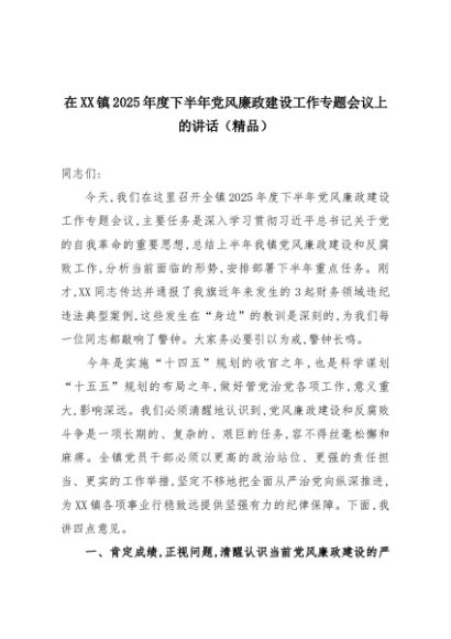 【七哥公文】2025年:在XX镇2025年度下半年党风廉政建设工作专题会议上的讲话(精品)+更多免费公文+VX:QiGeGongWen2024