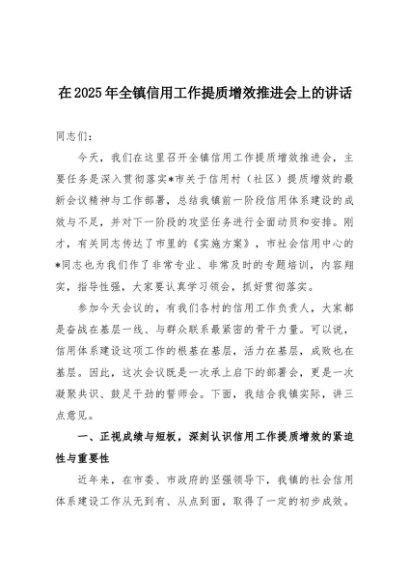 / 【七哥公文】2025年:在2025年全镇信用工作提质增效推进会上的讲话+更多免费公文+VX:QiGeGongWen2024