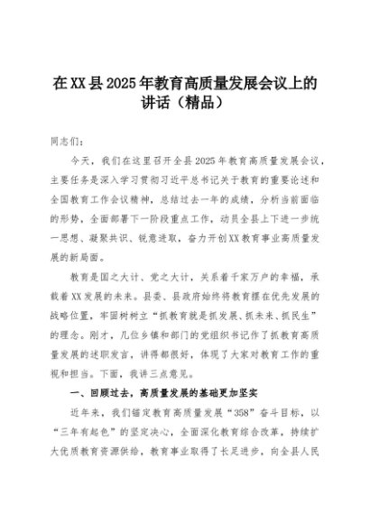 【七哥公文】2025年:在XX县2025年教育高质量发展会议上的讲话(精品)+更多免费公文+VX:QiGeGongWen2024