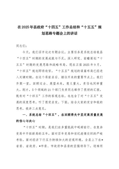 【七哥公文】2025年:在2025年县政府“十四五”工作总结和“十五五”规划思路专题会上的讲话+更多免费公文+VX:QiGeGongWen2024