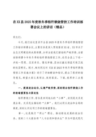 【七哥公文】2025年:在XX县2025年度秋冬季秸秆禁烧管控工作培训部署会议上的讲话(精品)+更多免费公文+VX:QiGeGongWen2024