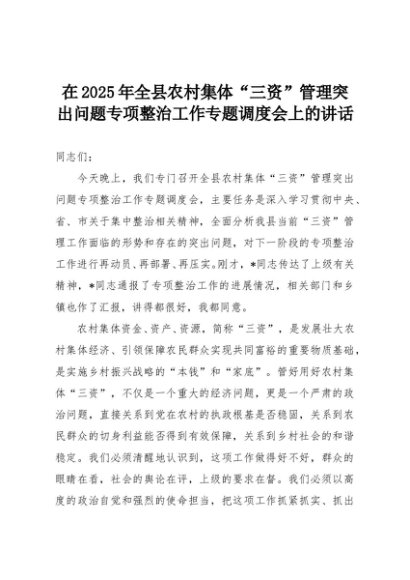 【七哥公文】2025年:在2025年全县农村集体“三资”管理突出问题专项整治工作专题调度会上的讲话+更多免费公文+VX:QiGeGongWen2024