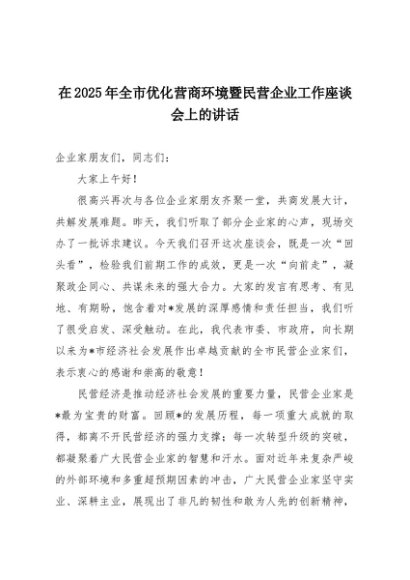 【七哥公文】2025年:在2025年全市优化营商环境暨民营企业工作座谈会上的讲话+更多免费公文+VX:QiGeGongWen2024